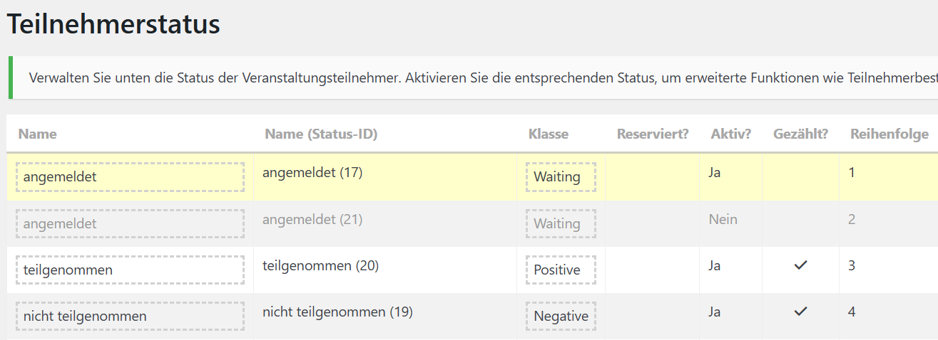 ich sehe in deinem Screenshot, dass beide “angemeldet“-Status benutzerdefiniert, also zusätzlich angelegt sind (ziemlich hohe ID) und vermute, dass es noch einen weiteren Status “registered“ gibt mit ID 1, der einen Haken in Spalte “reserviert” hat – ich kenne die Umstände nicht und weiß nicht, was bereits ausprobiert wurde, aber es sollte doch reichen, wenn dieser reservierte Satus in der ersten Spalte umbenannt wird, oder?