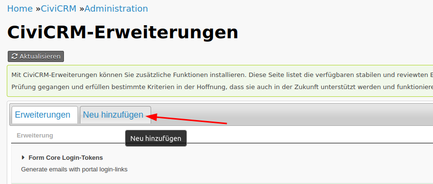 Rufe die Extension-Verwaltung von CiviCRM auf und gehe auf “neu hinzufügen”
