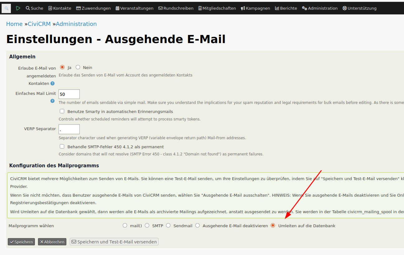Dann rufe in den Systemeinstellungen den Menüpunkt “Ausgehende E-Mail” auf, und speichere die Option “umleiten auf die Datenbank”.